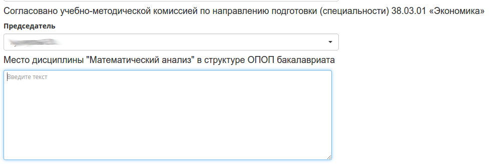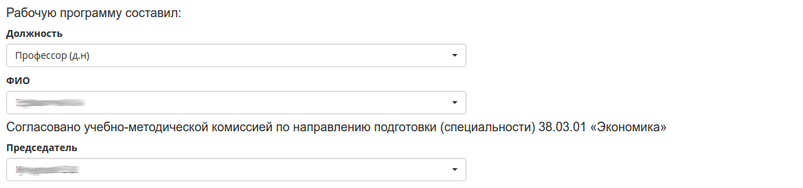 - Далее необходимо выбрать должность и ФИО сотрудника, который составил данный рабочий план для дисциплины, а также председателя УМК. Данные по номеру и дате протоколов будут выводится прочерками для собственноручного заполнения после вывода документа на печать. Данные по кафедрам будут сформированы автоматически для каждой дисциплины.