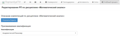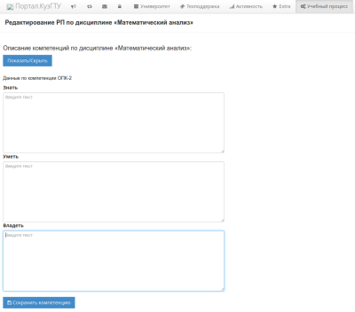 - Для ввода данных по компетенциям необходимо нажать кнопку «Показать/Скрыть», найти нужную компетенцию, ввести данные и нажать кнопку «Сохранить компетенцию». Данные по каждой компетенции сохраняются отдельно друг от друга. Сохранение РП не предполагает сохранение компетенций. Данные по «Уметь/Знать/Владеть» по каждой дисциплине будут сформированы в виде списка этих данных по каждой компетенции, прикрепленной к данной дисциплине.