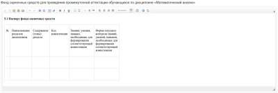 - Далее заполняется «Структура и содержание дисциплины». Если данных еще нет, то в окне будет приведен пример таблицы и заголовка, которые можно использовать для заполнения, но также можно вставить данные из документа типа Word. Чтобы добавить строку в таблицу необходимо нажать на таблицу правой кнопкой мыши и выбрать «Строка→Вставить строку снизу»