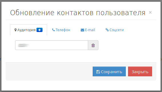 2. Добавление данных осуществляется с помощью кнопки и соответствующих вкладок: «Аудитория», «Телефон», «E-mail», «Соцсети» Для удаления устаревшей информации используйте кнопку