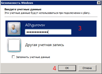 - В открывшемся окне «Введите учетные данные» вводим: поле «пользователь» - ad\<имя пользователя>, поле «Пароль» - <пароль>, где <имя пользователя> и <пароль> - Ваши учетные данные домена КузГТУ (Используемые при входе на Портал.КузГТУ)